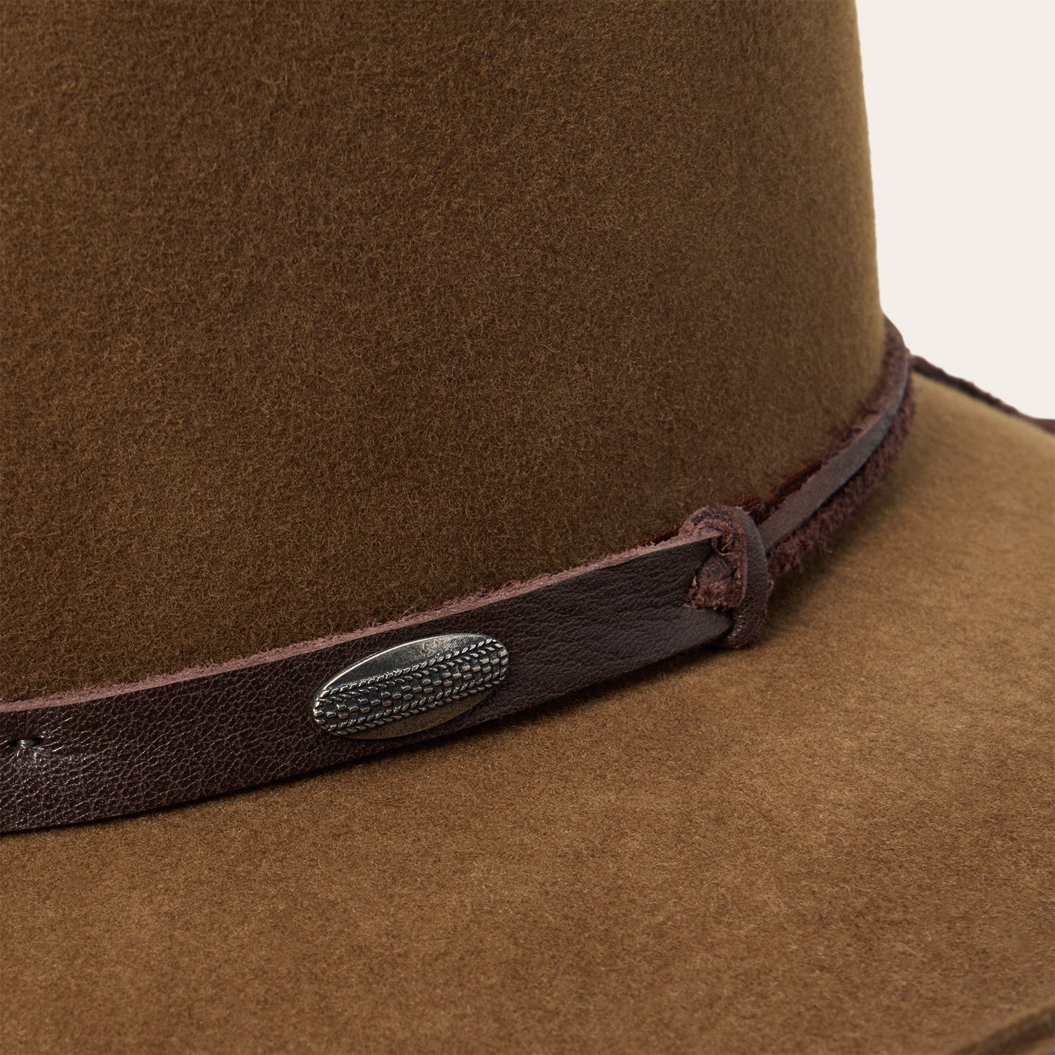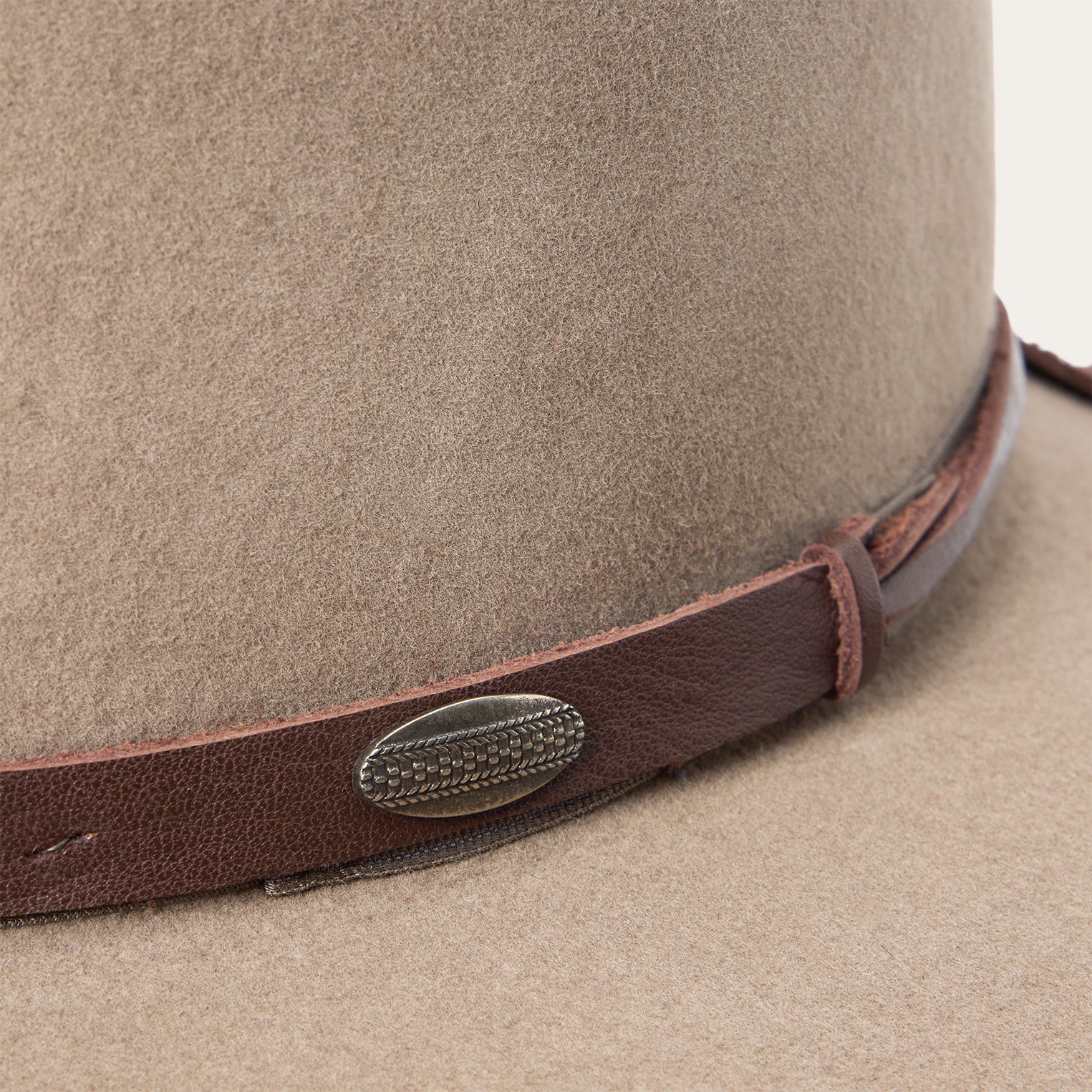 This western-inspired fashion hat brings a welcome pop of Cowboy Core to any look. Its bold silhouette features a statement-making 3 1/2″ telescope crown, 3 1/2” downturn brim and leather hat band with silver-tone conchos. Handmade in the U.S.A. with a firm finish from high-quality wool felt, it’s finished with a faux leather sweatband and satin liner for a comfortable, all-day fit.
