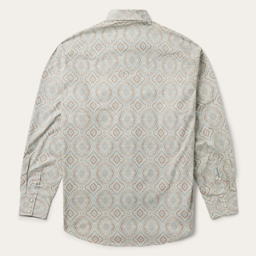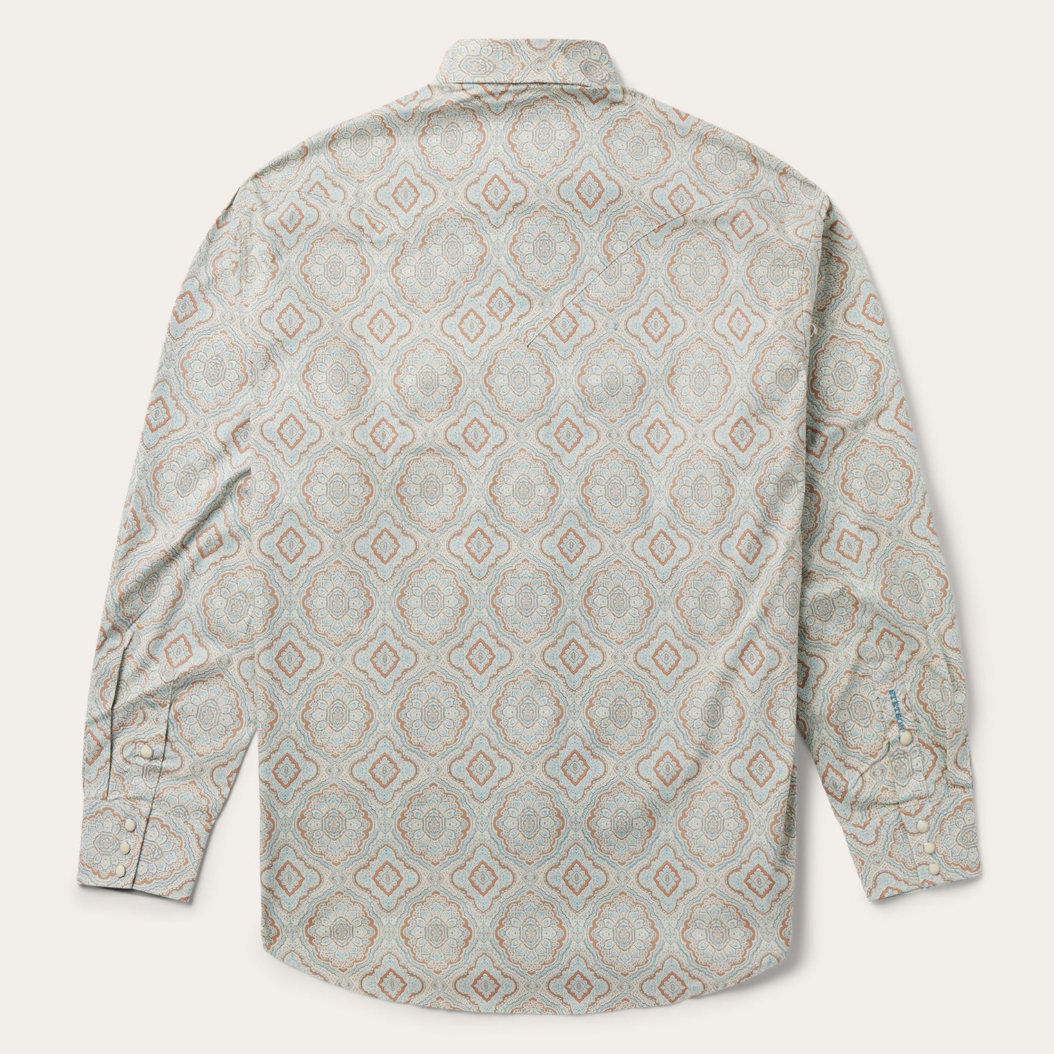 This Western shirt is crafted from a lightweight cotton poplin with a rich Aqua paisley print. It features a one-point curved back yoke, classic snap front featuring opaque logo snaps, and three snap cuffs. The front left pocket is adorned with the Stetson “S” logo and the right sleeve placket is embossed with “STETSON”. It has a contrast inside trim and is crafted with 100% cotton for quality, breathability and comfort.