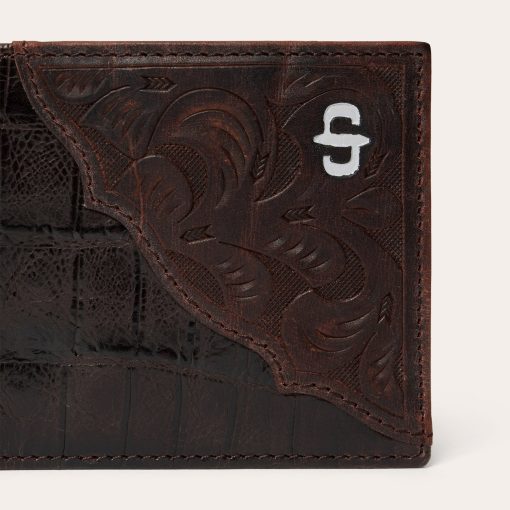 Made from top-grain leather, this bi-fold wallet features a brown embossed croco print and a tooled brown leather western overlay with an embossed Stetson logo. At once rugged and refined, each of our wallets embodies our legendary commitment to quality and attention to detail.