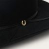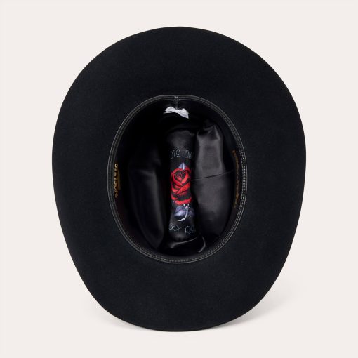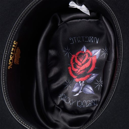 To create The Regal, Mars and the Stetson design team took a deep dive into the Stetson archive, finding inspiration in a bold silhouette that dates back to the 1870s. Called The Ranger, the original style features a 4 5/8″ cattleman crown and 3 1/2″ brim. Using this as a starting point, Mars added a 2-ply silk cord hatband, custom liner featuring a vintage-inspired rose motif, and gold-tone horseshoe pin with inlaid rhinestones.