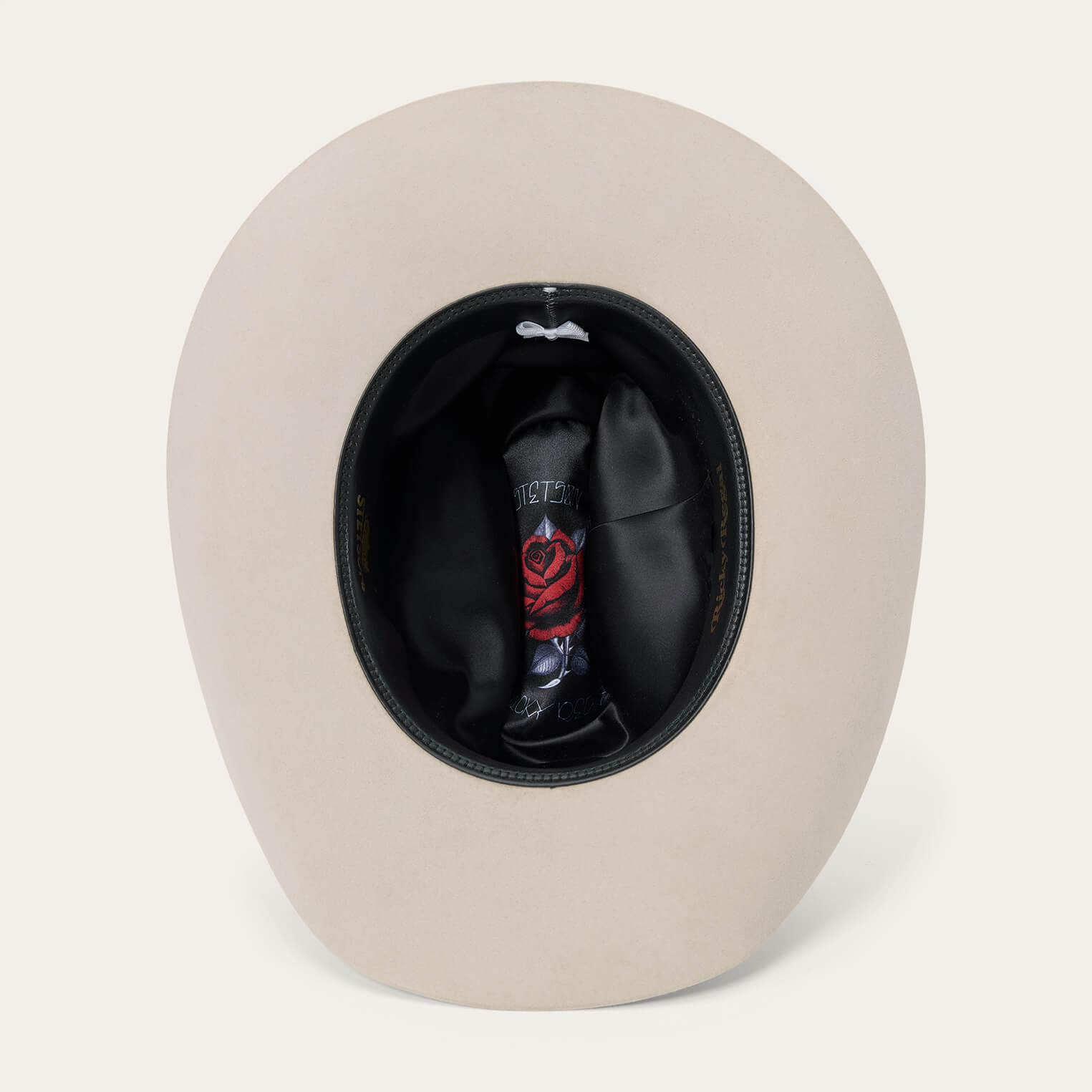 To create The Regal, Mars and the Stetson design team took a deep dive into the Stetson archive, finding inspiration in a bold silhouette that dates back to the 1870s. Called The Ranger, the original style features a 4 5/8″ cattleman crown and 3 1/2″ brim. Using this as a starting point, Mars added a 2-ply silk cord hatband, custom liner featuring a vintage-inspired rose motif, and gold-tone horseshoe pin with inlaid rhinestones.