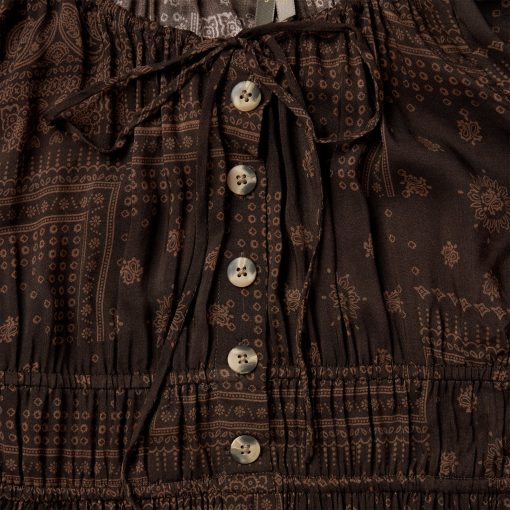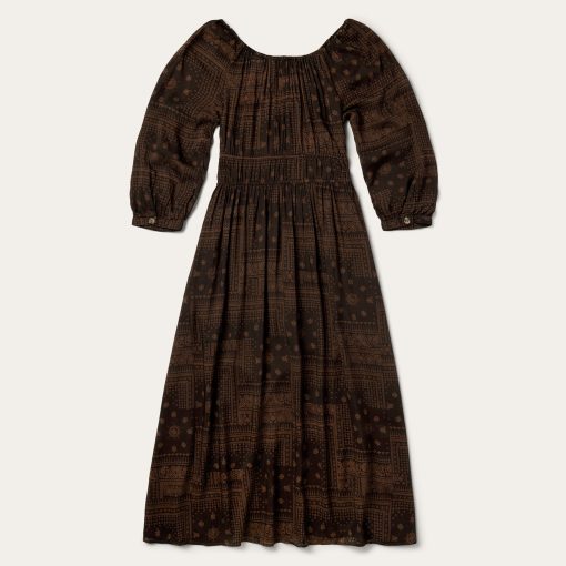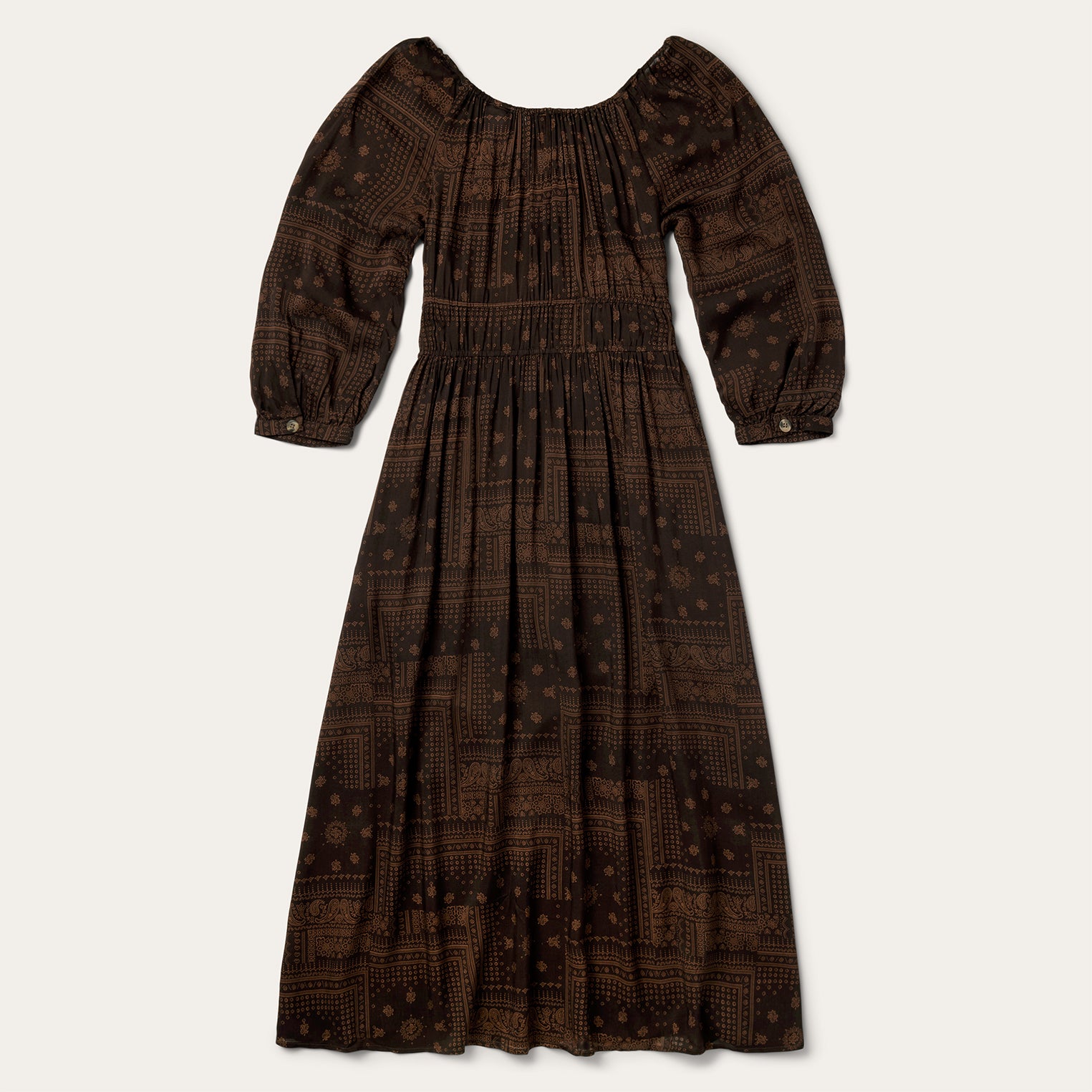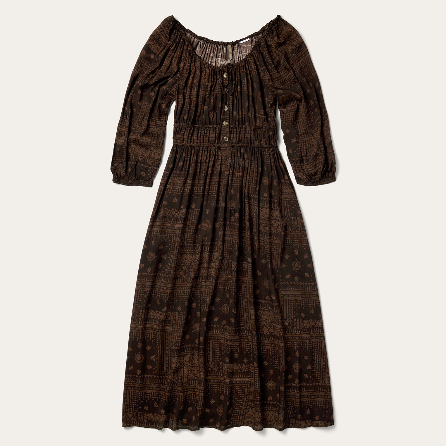 This peasant-style dress features an eye-catching Patchwork Bandana print and is crafted from 100% rayon for an easy, flattering drape and soft, silk-like feel. It has an elastic gathered neckline with self-tie, a button-front closure to the waist and double waist elastic gathering. The elbow-length raglan sleeves feature a single-button closure and pockets are featured at the side seams for convenience. Dial up your western style with an effortless look you can wear all year long.