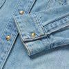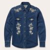 This long-sleeve light-wash denim shirt makes a statement with its cropped silhouette and large embroidered detail of a western landscape across its back. Crafted from 100% cotton, it’s designed to get more comfortable with. It has a full snap front with fold down collar, single point front patch pockets with pointed detail stitch and a single point back yoke.
