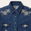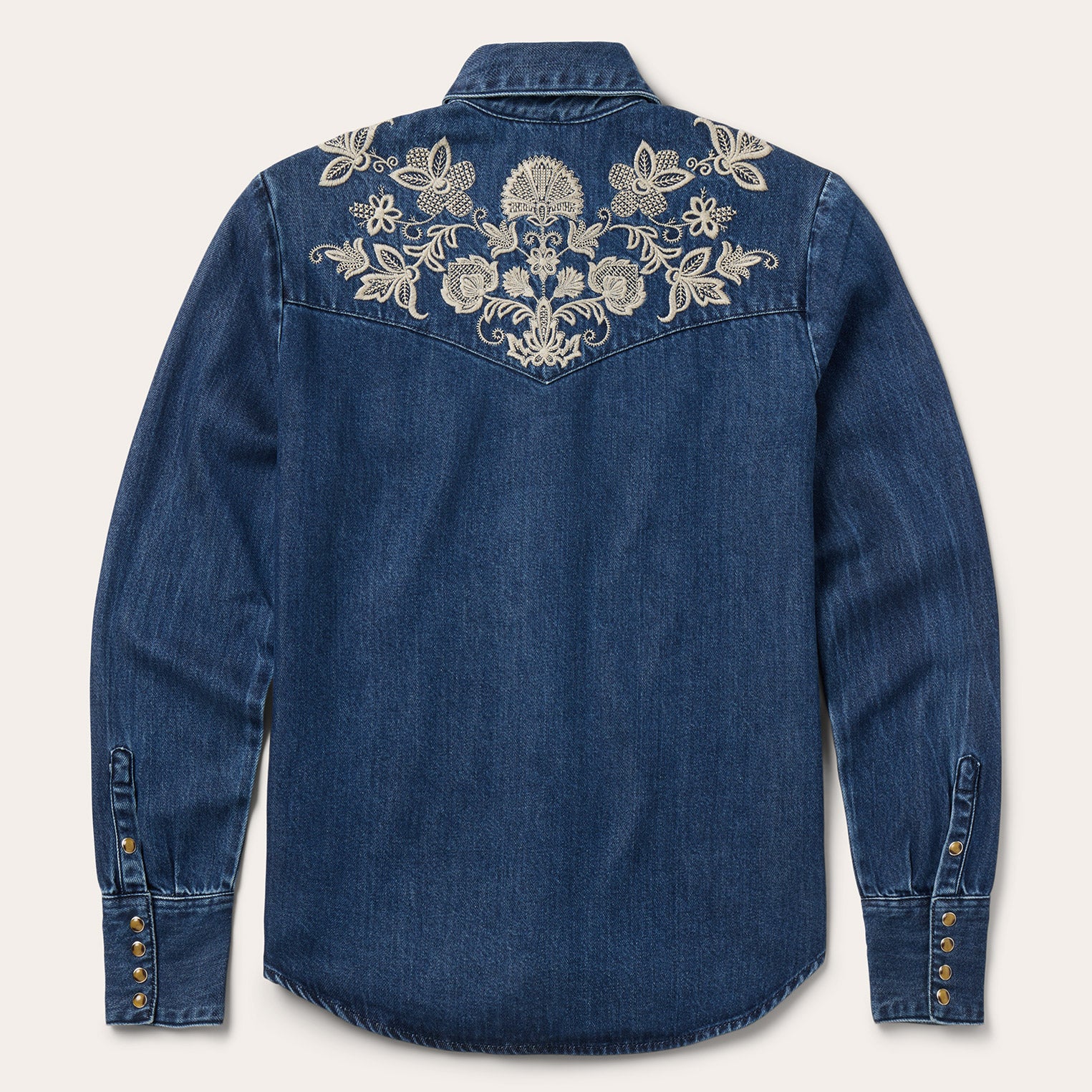 This denim western shirt is crafted from a soft Lyocell/rayon blend, and, like all of our true blue denim shirts, it’s made to get better with time and wear. On trend in the desert or in the city, it has statement-making floral embroidery, single-point curved front and back yokes, and front faux pocket flaps. Cut in our flattering boyfriend fit, which allows for all-day comfort and freedom of movement.