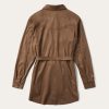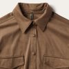 This stylish khaki faux suede western shirt is crafted from a soft faux suede with just a hint of stretch for maximum comfort and mobility. It features a large self-covered faux button snap front, fold down collar, drop shoulders, a one point curved back yoke, front chest patch pockets with flaps, snap cuffs and a self tie at the waist.