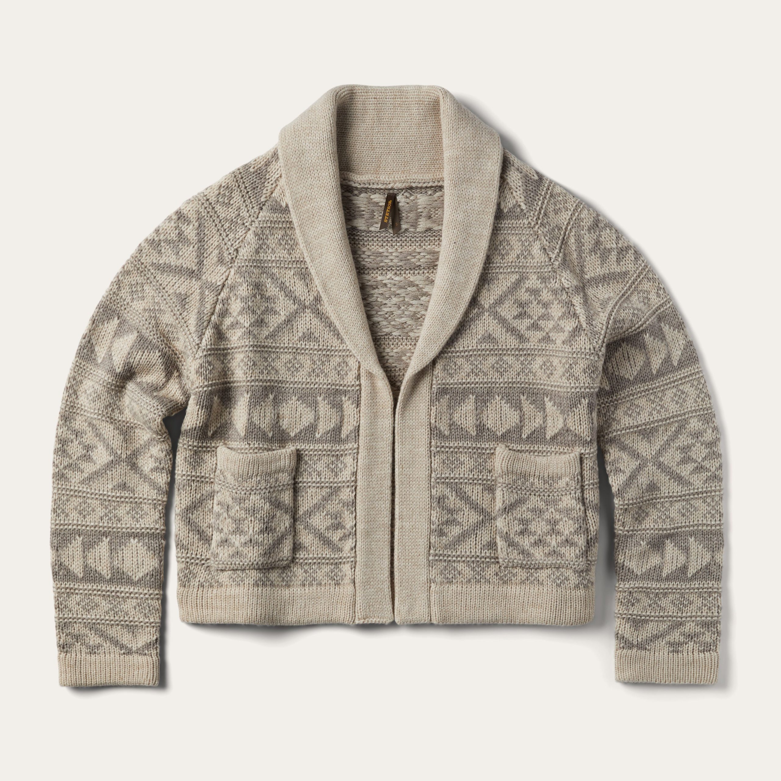 This stylish cropped cardigan features a neutral-toned Aztec-inspired print and is made of a cozy wool blend that’s perfect for when temperatures drop. It features ribbing at the shawl collar, cuff and hem, as well as two front patch pockets for added convenience. Easily paired with jeans and boots, it also lends a dash of Southwestern style over any dress.