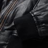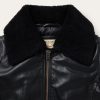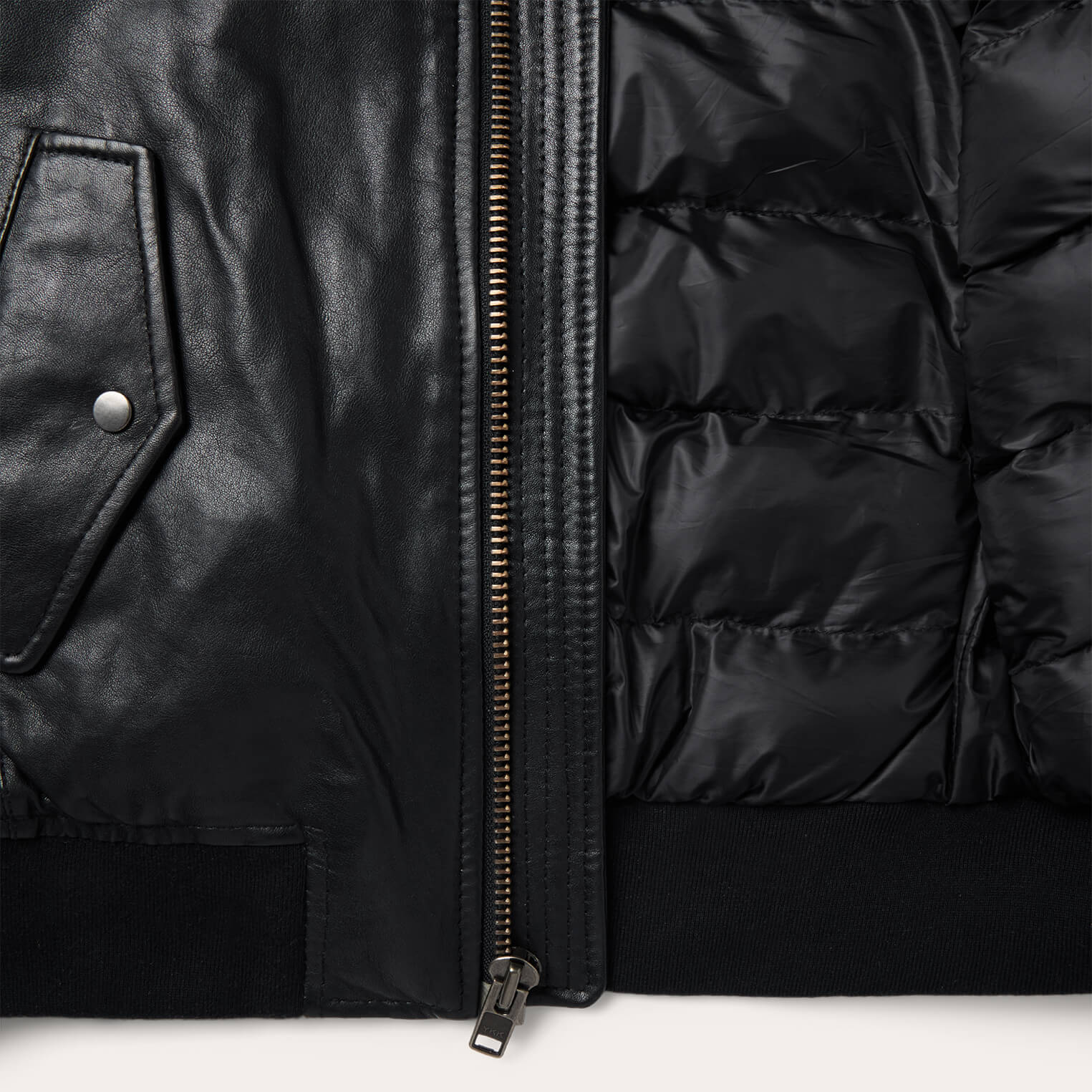 This classic bomber jacket is crafted from high-quality leather and features a statement-making oversized sherpa collar. It has a full front zip, princess seams, angled front hand pockets with single-point flaps and snap closure, rib knit cuffs and waistband and a flattering, fitted silhouette.
