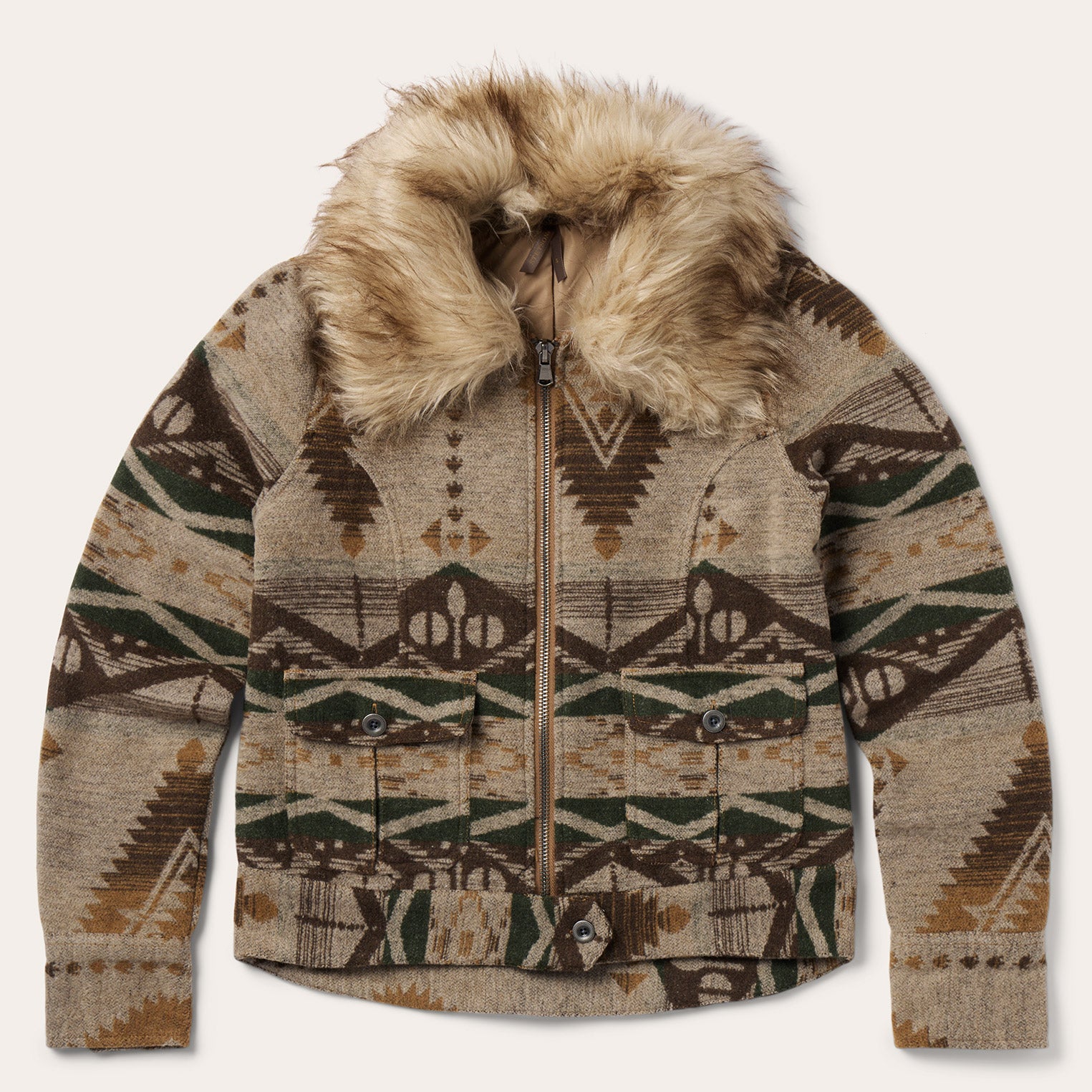 This southwestern-inspired flannel jacket is made from a hearty wool blend and is fully lined with quilted nylon for additional warmth on chilly desert nights. It has a spread collar, a straight back yoke, square mitered chest pockets with flaps and snap closure, side seam pockets, a one-snap adjustable cuff and full snap front with hidden zipper. At Stetson, we’ve been outfitting men who venture into harsh, weather-worn territories since 1865—this is quality you can rely on.