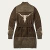 Celebrating Stetson’s rich tradition of western style, this retro-style belted cardigan features a statement-making vintage steer and star motif. It has wide-ribbing at the collar, front placket, sleeves and hems, a self tie waist, two patch pockets and large dressmaker snap closure. Made from a cozy wool blend, it has a flowing, easy drape that pairs perfectly over your favorite jeans.