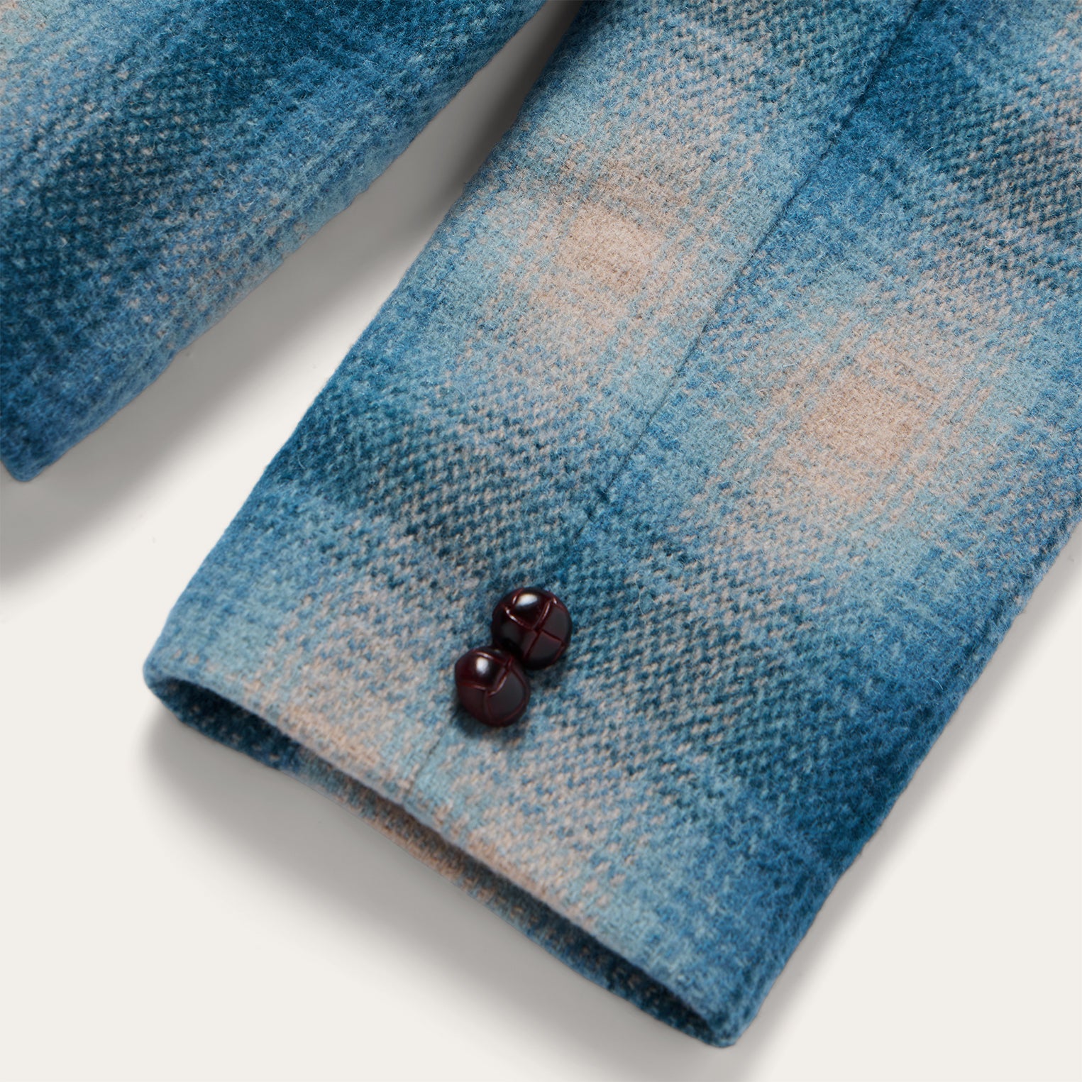 This stylish three-button ombre plaid blazer is crafted from high-quality 100% wool and has a western-inspired style. Authentic details include fancy curved front and back yokes, two inset pockets with flaps and button closure and two-button cuffs. A darted waistline and princess seaming provides a flattering, fitted silhouette, while still allowing for all-day comfort and freedom of movement.