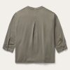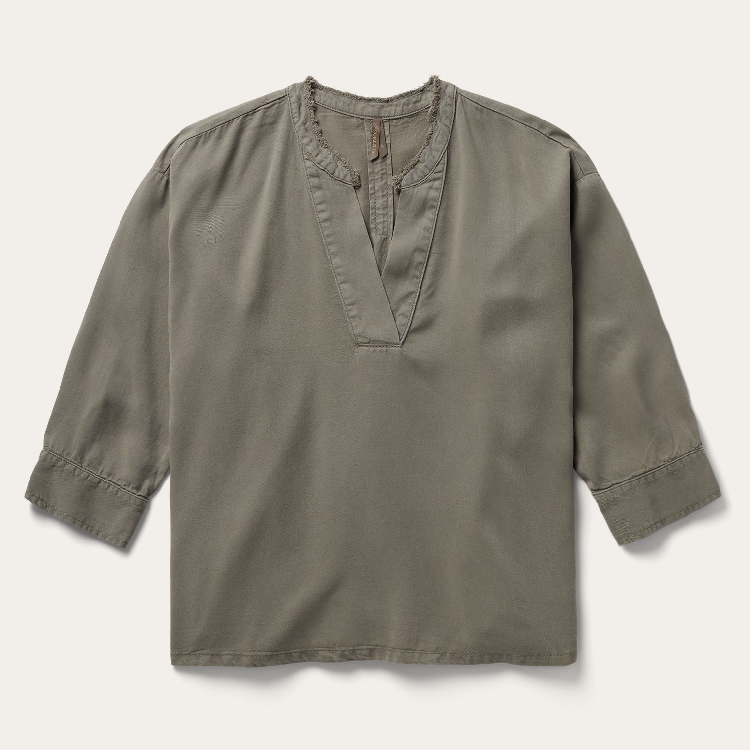 This Olive Lyocell Peasant blouse is crafted from durable 100% lyocell denim twill that has been yarn dyed a rich olive color. It features a flattering V-neck with raw edge collar treatment, finished edge bottom hem and ¾ sleeves with single button cuffs. A pleat at the center back enhances the fit for a casual, Western-inspired top that’s ideal for evening or everyday wear.
