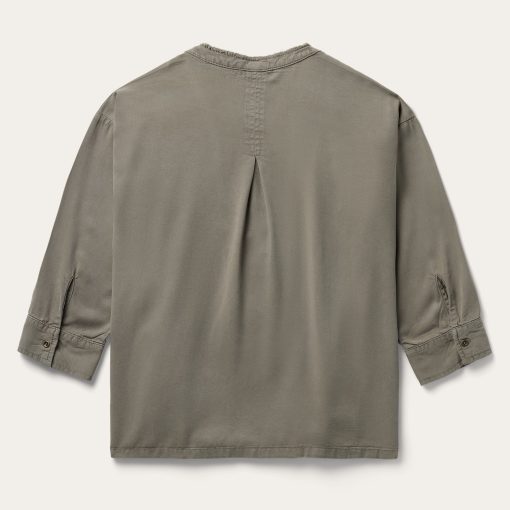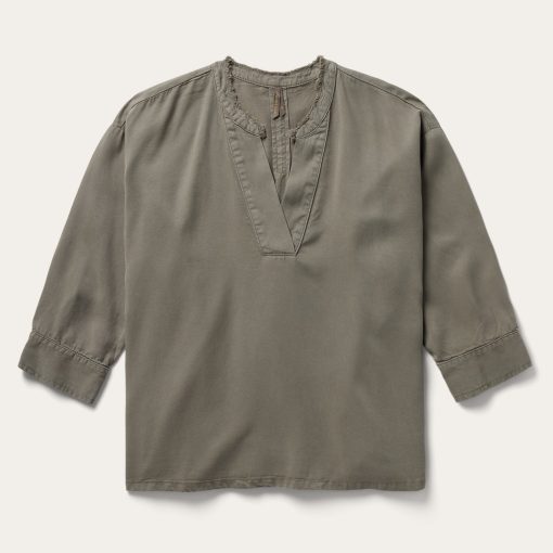 This Olive Lyocell Peasant blouse is crafted from durable 100% lyocell denim twill that has been yarn dyed a rich olive color. It features a flattering V-neck with raw edge collar treatment, finished edge bottom hem and ¾ sleeves with single button cuffs. A pleat at the center back enhances the fit for a casual, Western-inspired top that’s ideal for evening or everyday wear.