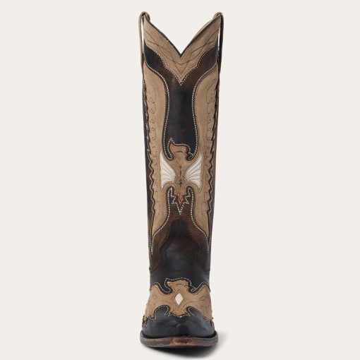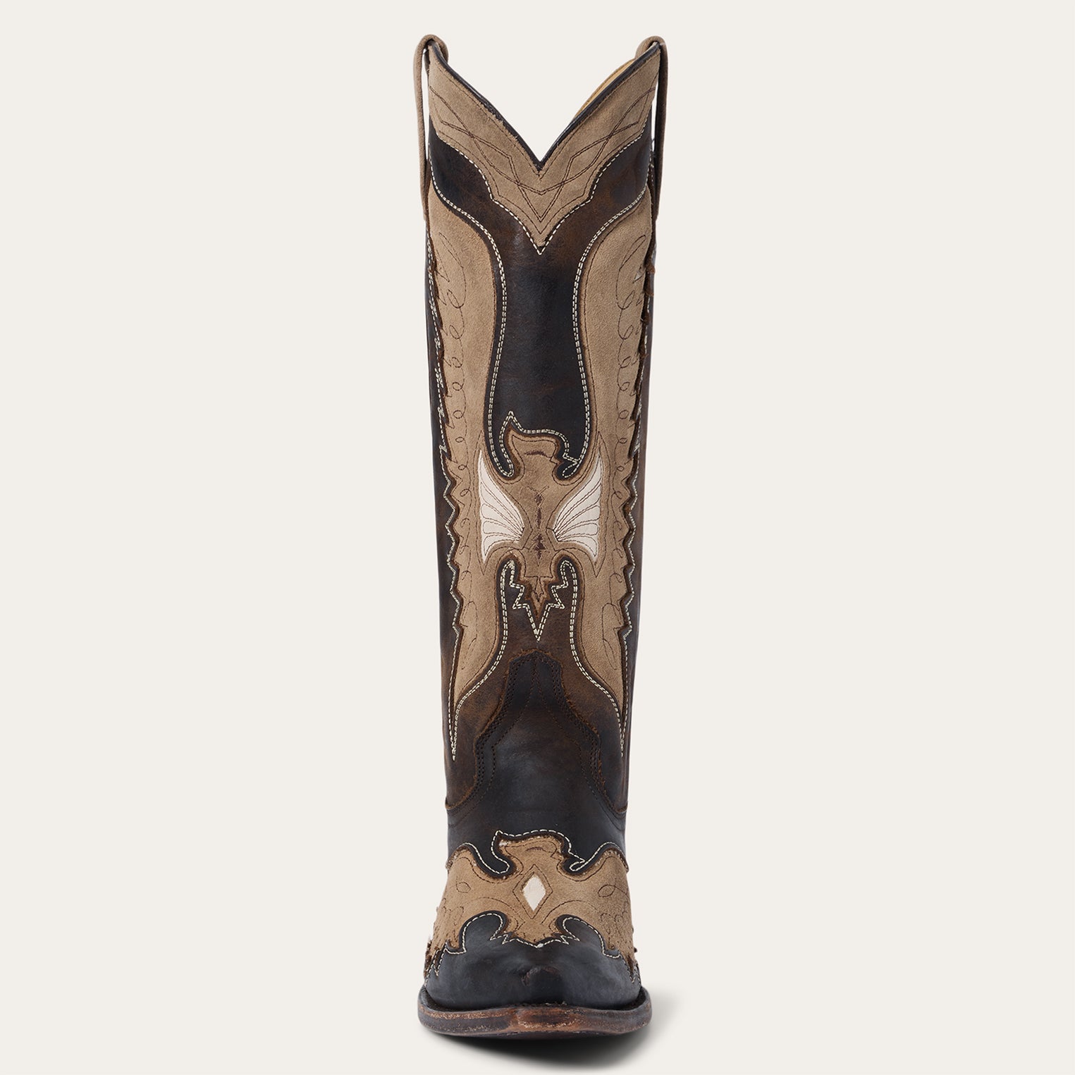 The Lottie Boot features a leather vamp and 15” leather shaft with an eye-catching eagle underlay. It has a snip toe—the ultimate statement-making style. Its quality construction includes single welt leather soles with brass nails and lemonwood pegs, hand-stacked leather heel, premium leather lining and a cushioned leather insole that ensures comfort and support in every step.